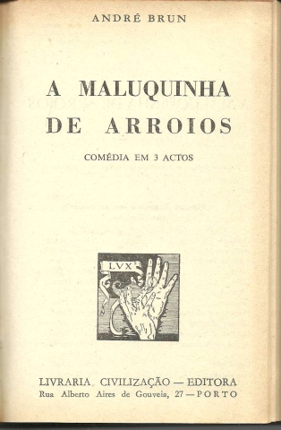 A MALUQUINHA DE ARROIOS. Comédia em 3 actos. *** André Brun *** Porto: Livraria Civilização – Editora, 1962. (16 x 11 cm.) com 242 + [2] pp. Encadernação editorial em material sintético castanho com gravações douradas na lombada e conservando a capa de brochura da frente. Exemplar razoável. Encadernação com pequenas marcas de manuseamento e apresentando-se ligeiramente amachucada em alguns pontos nas margens, mas, de um modo geral, ainda em bom estado e limpa. Capa original com pequenas marcas de uso e um pouco amarelecida (e, aparentemente, também um pouco aparada, para uniformizá-la com o tamanho das páginas), mas, globalmente, ainda em bom estado e limpa. Páginas bem conservadas e limpas, embora apresentem um tom amarelecido (ligeiramente mais forte nas margens), próprio do papel. *** Primeira edição na editora desta comédia representada pela primeira vez no Teatro República, de Lisboa, em 14 de Fevereiro de 1916, que é geralmente considerada a obra-prima do Autor no campo teatral, tendo-se André Brun distinguido igualmente como cronista de tom humorístico. Esta peça seria adaptada, em 1970, para o cinema, num filme homónimo realizado por Henrique Campos. *** Portes: envio gratuito em correio normal (tarifa especial para livros) * envio em correio registado: 1,70