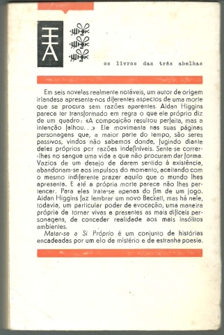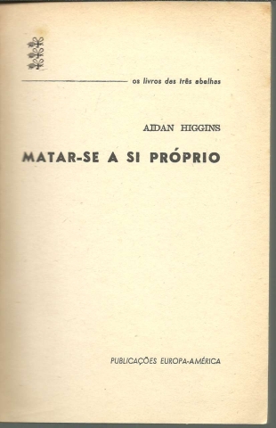 MATAR-SE A SI PRÓPRIO. *** Aidan Higgins *** Este livro foi traduzido da edição original inglesa com o título Felo de Se *** Tradução de António Neves Pedro *** [Sem ind. de local: Lisboa (?)]: Publicações Europa-América, 1966. Colecção: Os Livros das Três Abelhas – 85. (18 x 11,5 cm.) com 236 + [4] pp. Capa flexível. Exemplar razoável. Capa com marcas de manuseamento, pequenos vincos, manchas ligeiras, pequenas perdas de cor em alguns pontos e um pouco gasta nas margens e na lombada, que se encontra também algo danificada na base, apresentando rasgões já fixados com cola. Apesar de tudo, globalmente, está ainda apresentável. Páginas globalmente limpas e bem conservadas, embora apresentem um tom amarelecido e algumas manchas de acidez (não muito frequentes, concentrando-se sobretudo nas margens das primeiras e das últimas). *** Primeira edição portuguesa deste livro do aclamado escritor irlandês Adam Higgins, que foi recomendado por Samuel Beckett ao seu editor londrino, John Calder, que o publicou pela primeira vez, em 1960, e que seria mais tarde editado pela Grove Press, de Nova Iorque e pela própria editora de Beckett em Paris. Livro de estreia do Autor, onde se nota a influência de Beckett e James Joyce e onde se encontra a novela “O Prado de Killachter”, que seria depois desenvolvida, dando origem ao romance Langrishe, Go Down (1966), considerada a sua obra-prima. *** Portes: envio gratuito em correio normal (tarifa especial para livros) * envio em correio registado: 1,70