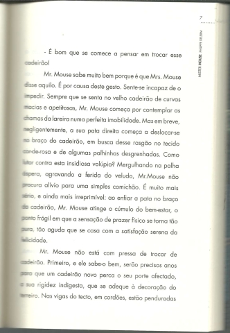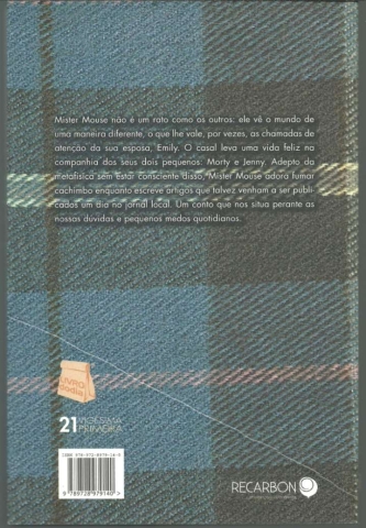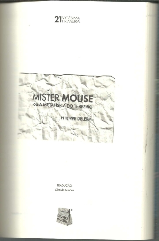 MISTER MOUSE ou A Metafísica do Terreiro. *** Philippe Delerm *** Tradução: Clotilde Simões *** Título original: Mister Mouse ou La Métaphysique du Terrier *** Torres Vedras: Livrododia Editores, 2007. Colecção: Vigésima Primeira. (21 x 14 cm.) com [2] + 153 + [5] pp. Capa flexível, com badanas. Bom exemplar. Capa com ligeiras marcas de manuseamento, encontrando-se em bom estado e limpa. Páginas bem conservadas e limpas. *** Primeira edição portuguesa deste livro sobre o qual, em jeito de sinopse, se lê na contracapa: «Mister Mouse não é um rato como os outros: ele vê o mundo de uma maneira diferente, o que lhe vale, por vezes, as chamadas de atenção da sua esposa, Emily. O casal leva uma vida feliz na companhia dos seus dois pequenos: Morty e Jenny. Adepto da metafísica sem estar consciente disso, Mister Mouse adora fumar cachimbo enquanto escreve artigos que talvez venham a ser publicados um dia no jornal local. Um conto que nos situa perante as nossas dúvidas e pequenos medos quotidianos.» *** Portes: envio gratuito em correio normal (tarifa especial para livros) * envio em correio registado: 1,70