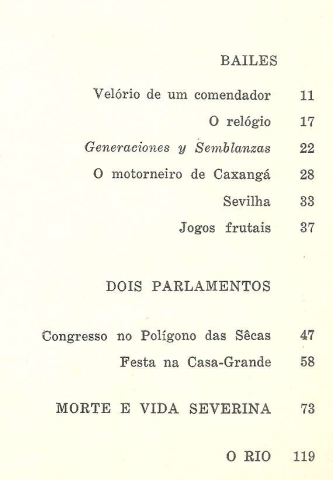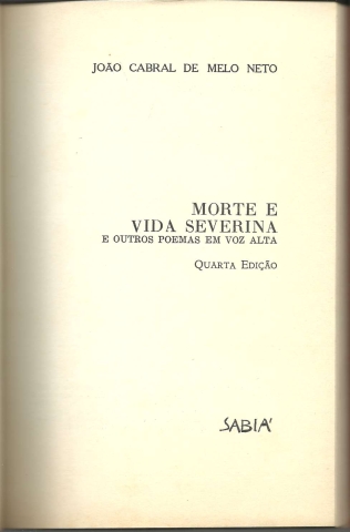 MORTE E VIDA SEVERINA e Outros Poemas em Voz Alta. *** João Cabral de Melo Neto *** Rio de Janeiro: Editôra Sabiá, 1971. (21 x 14 cm.) com 148 + [4] pp. Com algumas ilustrações a p/b.. Capa flexível, com badanas. Exemplar razoável. Capa com marcas de manuseamento, um pouco amarelecidas e apresentando um ligeiro desgaste nas margens e na lombada, mas, de um modo geral, ainda em boas condições e limpa. Páginas bem conservadas e limpas, embora apresentem um tom amarelecido e algumas pequenas e ténues manchas de acidez (raras), tudo devido fundamentalmente ao tipo de papel utilizado. *** 4.ª edição deste livro que reúne alguns poemas de João Cabral de Melo Neto, um dos mais importantes nomes da poesia brasileira contemporânea. Numa nota da editora pode ler-se: «Êste livro, de poemas que talvez funcionem em voz alta (para a meia-atenção ou quarta parte de atenção que, em geral, é quanto pode receber o poema que se ouve), contém: um auto (Morte e Vida Severina), um monólogo (O Rio), dois poemas que, ao serem publicados, o autor apelidou “parlamentos”, e outros poemas menores que, com êsses dois, por implicarem mais de uma voz, parecem, senão pedir, ao menos suportar uma leitura a vozes, e conseqüentemente, em voz alta. Êstes últimos foram aqui apelidados “bailes”, usando-se, com muita liberdade, uma palavra que no teatro espanhol antigo servia para designar “una obra dramática muy breve, que combina la letra, la mímica y la música, y que se representaba generalmente entre las jornadas primera y segunda de una comedia” (Dicionário de Literatura Española, Revista de Ocidente, Madrid, 1949).» (Índice na imagem 4). *** Portes: envio gratuito em correio normal (tarifa especial para livros) * envio em correio registado: 1,70
