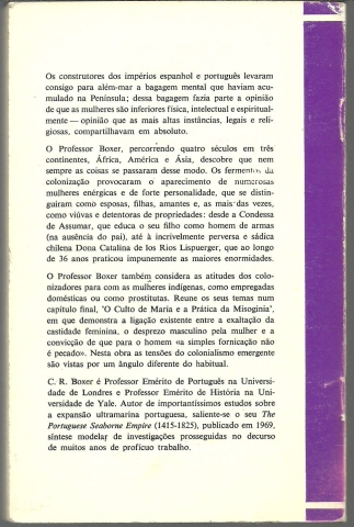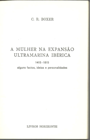 A MULHER NA EXPANSÃO ULTRAMARINA IBÉRICA – 1415-1815. Alguns Factos, Ideias e Personalidades. *** C. R. Boxer *** Título [original]: Mary and Misogyny *** Tradução de: Saúl Barata *** Lisboa: Livros Horizonte, 1977. Colecção Horizonte – 35. (18 x 11,5 cm.) com 160 + [8] pp. Capa flexível. Exemplar razoável. Capa com marcas de manuseamento, pequenas perdas de cor em alguns pontos, manchas ligeiras, algumas arranhadelas e um pouco gasta nas margens e na lombada, que apresenta também vincos de abertura. Apesar de acusar o uso, de um modo geral, está ainda bastante apresentável. Páginas bem conservadas e limpas. Tem uma pequena etiqueta da editora colada na primeira página. *** Primeira edição portuguesa desta obra que resulta fundamentalmente de um conjunto de quatro conferências proferidas pelo Autor na Universidade Bryn Mawr, em honra de Mary Flexner, em Outubro e Novembro de 1972, e nas quais o Autor procurou abordar alguns aspectos relacionados com a presença da mulher na sociedade colonial ibérica. Lê-se na contracapa: «Os construtores dos impérios espanhol e português levaram consigo para além-mar a bagagem mental que haviam acumulado na Península; dessa bagagem fazia parte a opinião de que as mulheres são inferiores física, intelectual e espiritualmente – opinião que as mais altas instâncias, legais e religiosas, compartilhavam em absoluto. O Professor Boxer, percorrendo quatro séculos em três continentes, África, América e Ásia, descobre que nem sempre as coisas se passaram desse modo.» (Índice na imagem 4). Há muito esgotado. *** Portes: envio gratuito em correio normal (tarifa especial para livros) * envio em correio registado: 1,70