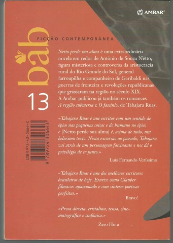 NETTO PERDE SUA ALMA. *** Tabajara Ruas *** Porto: Ambar, 2003. Colecção: BAB – Biblioteca Ambar de Bolso – 13. (19 x 13 cm.) com 174 + [2] pp. Capa flexível. Exemplar razoável. Capa com marcas de manuseamento, alguns vincos discretos e um ligeiro desgaste nas margens, mas, de um modo geral, ainda em bom estado e limpa. Páginas globalmente bem conservadas e limpas, embora apresentem um ligeiro amarelecimento, próprio do papel, e algumas pequenas manchas de acidez, que atingem quase só os cortes e as margens das primeiras e das últimas. Tem, no entanto, um carimbo de posse no canto inferior direito da primeira página, que ficou também parcialmente espelhado na parte de dentro da capa da frente. *** Primeira edição portuguesa desta novela de fundo histórico sobre Antônio de Souza Netto, «figura misteriosa e controversa da aristocracia rural do Rio Grande do Sul, general farroupilha e companheiro de Garibaldi nas guerras de fronteira e revoluções republicanas que grassaram na região [sul do Brasil] no século XIX.» O Autor é um conceituado escritor brasileiro e também cineasta, tendo realizado, com Beto Souza, um filme homónimo a partir desta sua obra. *** Portes: envio gratuito em correio normal (tarifa especial para livros) * envio em correio registado: 1,70