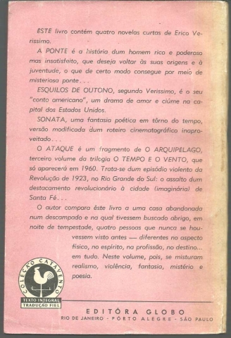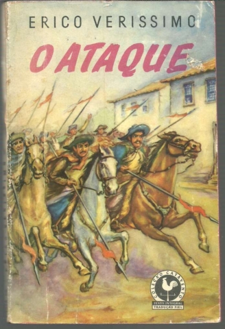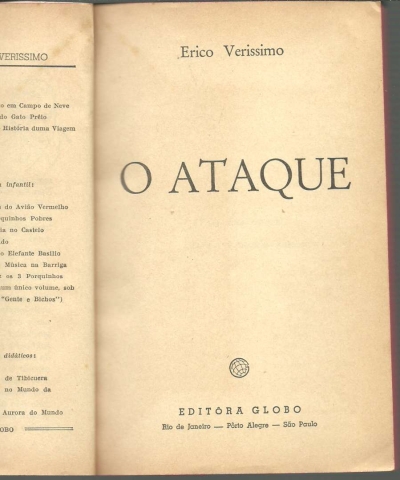 O ATAQUE. *** Erico Verissimo *** Rio de Janeiro – Pôrto Alegre – São Paulo: Editôra Globo, [Sem ind. de ano: 1958 ou 1959]. Coleção Catavento – 1. (18 x 11,5 cm.) com [10] + 193 + [1] pp. Capa flexível. Exemplar razoável. Capa com marcas de manuseamento, pequenas perdas de cor em alguns pontos, pequenos vincos, algumas arranhadelas (a mais importante na capa da frente, do lado direito do título) e um pouco gasta nas margens e na lombada. Apesar de algo envelhecida, de um modo geral, está ainda muito apresentável. Páginas bem conservadas e limpas, embora apresentem um tom amarelecido, próprio do papel. Tem, no entanto, uma assinatura de posse e um número manuscrito no canto superior direito da primeira página. Cortes carminados (de origem). *** Primeira edição deste livro que reúne quatro contos (ou novelas curtas) de Erico Verissimo, sobre os quais se pode ler na contracapa: «A PONTE é a história de um homem rico e poderoso mas insatisfeito, que deseja voltar às suas origens e à juventude, o que de certo modo consegue por meio de misteriosa ponte... ESQUILOS DE OUTONO, segundo Verissimo, é o seu “conto americano”, um drama de amor e ciúme na capital dos Estados Unidos. SONATA, uma fantasia poética em tôrno do tempo, versão modificada dum roteiro cinematográfico inaproveitado. O ATAQUE é um fragmento de O Arquipélago, terceiro volume da trilogia O Tempo e o Vento, que só aparecerá em 1960. Trata-se dum episódio violento da Revolução de 1923, no Rio Grande do Sul: o assalto dum destacamento revolucionário à cidade (imaginária) de Santa Fé... O autor compara êste livro a uma casa abandonada num descampado e na qual tivessem buscado abrigo, em noite de tempestade, quatro pessoas que nunca se houvessem visto antes – diferentes no aspecto físico, no espírito, na profissão, no destino... em tudo. Neste volume, pois, se misturam realismo, violência, fantasia, mistério e poesia.» (Índice na imagem 3). *** Portes: envio gratuito em correio normal (tarifa especial para livros) * envio em correio registado: 1,70