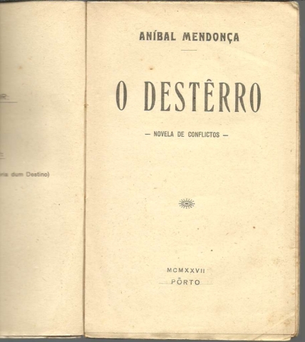 O DESTÊRRO. Novela de Conflictos. *** Aníbal Mendonça *** Pôrto: [Sem ind. de editor: provável Edição do Autor], 1927. ( Tip. Sequeira, Limitada – Pôrto). (19 x 12 cm.) com 113 + [3] pp. Capa flexível. Exemplar razoável. Capa envelhecida, com evidentes marcas de manuseamento, manchada, ligeiramente empoeirada e um pouco gasta nas margens e na lombada, que apresenta mesmo rasgões que foram fixados com cola. Páginas em relativo bom estado, embora apresentem um tom amarelecido, próprio do papel e pequenas manchas de acidez (pouco frequentes). Na última página apresenta, no entanto, uma inscrição manuscrita em caligrafia antiga e as últimas folhas têm uma mancha escura junto da lombada, que não atinge a parte impressa. Em suma: bom exemplar para leitura, mas envelhecido e algo maltratado. *** Primeira edição desta novela (publicada quando o Autor tinha apenas 19 anos) do escritor e jornalista Aníbal Soares de Mendonça, natural de Ansião, mas que cedo ainda se fixaria em Braga, onde foi correspondente do jornal O Primeiro de Janeiro e onde acabaria por falecer, em 1990. *** Portes: envio gratuito em correio normal (tarifa especial para livros) * envio em correio registado: 1,70