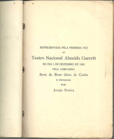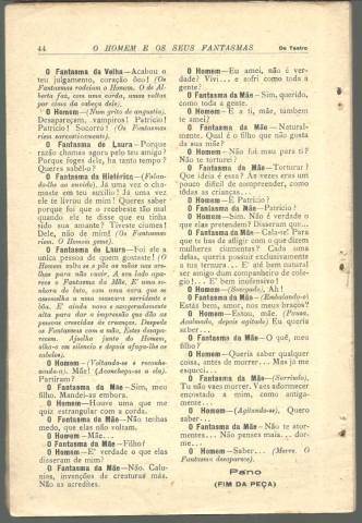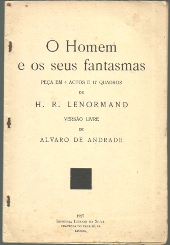 O HOMEM E OS SEUS FANTASMAS. Peça em 4 actos e 17 quadros. *** H. R. Lenormand *** Versão livre de Alvaro de Andrade *** Lisboa: Imprensa Libanio da Silva, 1927. (24 x 16 cm.) com 44 pp. O volume não tem capa própria, servindo o rosto também de capa e tendo três agrafos a unir as páginas, mas julgo que foi mesmo assim que foi lançado originalmente. Exemplar razoável. Páginas globalmente bem conservadas e limpas, embora o papel se encontre amarelecido e apresentem algumas manchas de acidez (pequenas e raras). Os agrafos que unem as páginas estão um pouco oxidados. *** Primeira edição portuguesa, publicada em separata da 2.ª série do mensário De Teatro, dirigido por Mário Duarte. A peça foi “representada pela primeira vez no Teatro Nacional Almeida Garrett no dia 1 de Dezembro de 1926 pela Companhia Berta de Bivar – Alves da Cunha e ensaiada por Araujo Pereira”. Henri-René Lenormand foi um dramaturgo francês, considerado o mais importante daqueles que procuraram explorar nas suas peças, sobretudo entre a Primeira e a Segunda Guerra Mundiais, as motivações subconscientes. Filho de um compositor, passou grande parte da sua vida adulta a escrever para os palcos parisienses, deixando uma série de peças um tanto sombrias, que exploram os conflitos emocionais internos e as tragédias do destino humano. As suas dissecações da personalidade humana centram-se em instintos e motivações subconscientes, que são, na sua maioria, de carácter negativo. O Homem e os seus Fantasmas (L’Homme et ses Fantômes), escrita em 1924, inspirando-se na figura mítica de Don Juan, rendeu-lhe a reputação de freudiano, pelas suas explorações do complexo de Édipo. Texto da peça a duas colunas. Invulgar. *** Portes: envio gratuito em correio normal (tarifa especial para livros) * envio em correio registado: 1,70