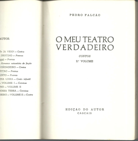 O MEU TEATRO VERDADEIRO. Contos. 2.º Volume. *** Pedro Falcão *** Cascais: Edição do Autor, 1981. (Composto e impresso na Tipografia Cardim – Cascais). (19 x 13 cm.) com [4] + 184 + [4] pp. Capa flexível. Exemplar razoável. Capa com marcas de manuseamento, alguns vincos, pequenas perdas de cor em alguns pontos, manchas e um pouco gasta nas margens (que se encontram também ligeiramente amachucadas em alguns pontos) e na lombada, que apresenta igualmente vincos de abertura. Apesar de acusar o uso e algum envelhecimento, de um modo geral, está ainda apresentável. Páginas globalmente bem conservadas e limpas, embora apresentem um ligeiro amarelecimento e algumas manchas ténues, que incidem sobretudo nas primeiras e nas últimas. Tem uma etiqueta de uma distribuidora colada na primeira página. *** Primeira edição desta colectânea de contos de fundo poético do ilustre escritor, poeta e artista cascalense Pedro Falcão, recordado sobretudo pelas crónicas sobre a sua terra natal que reuniu em Cascais Menino. (Índice na imagem 4). Capa de Raul Indipwo, um dos cantores do Duo Ouro Negro. Invulgar. *** Portes: envio gratuito em correio normal (tarifa especial para livros) * envio em correio registado: 1,70
