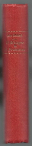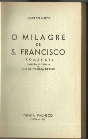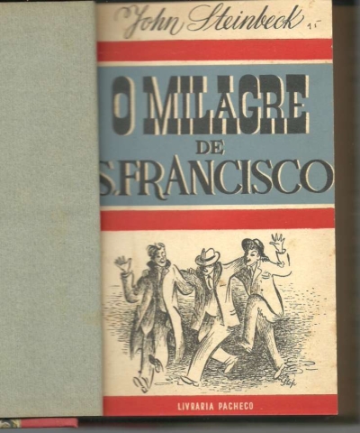 O MILAGRE DE S. FRANCISCO. (Romance). *** John Steinbeck *** Tradução portuguesa de José da Fonseca Bizarro *** Êste livro tem no original americano, o título: Tortilla Flat *** Lisboa: Livraria Pacheco, 1945. (19 x 12 cm.) com 367 + [9] pp. Encadernado, conservando a capa da frente original. Exemplar razoável. Encadernação com lombada em percalina vermelha e as pastas recobertas por papel marmoreado; na lombada (lisa) tem o nome do autor e o título gravados a ouro. Encadernação com marcas de manuseamento, um pouco gastas nas margens, pequenas perdas de cor em alguns pontos e com as extremidades da lombada algo amachucadas. Apesar de tudo, de um modo geral, está ainda em boas condições. Capa original bem conservada e limpa, embora apresente um ligeiro amarelecimento e algumas pequenas manchas de acidez (tudo de reduzida importância). Páginas em bom estado e, globalmente, limpas, embora mostrem um tom amarelecido e algumas manchas de acidez, não muito frequentes, nem muito importantes. *** Primeira edição portuguesa de um dos primeiros romances de John Steinbeck, originalmente publicado em 1935, e que constituiu provavelmente o seu primeiro êxito, tanto junto do público como da crítica. Ambientado em Monterey, na Califórnia, o romance ocupa-se de algumas personagens marginais, que procuram aproveitar a vida nos tempos imediatos ao final da Primeira Guerra Mundial. Pouco vulgar nesta edição. *** Portes: envio gratuito em correio normal (tarifa especial para livros) * envio em correio registado: 1,70