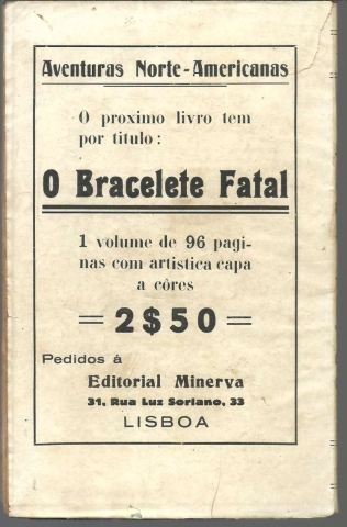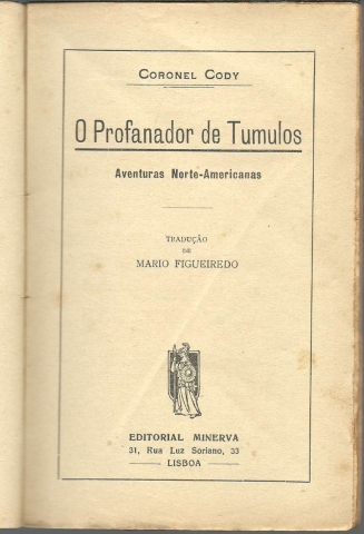 O PROFANADOR DE TUMULOS. Aventuras Norte-Americanas. *** Coronel Cody [John Harvey Whitson] *** Tradução de Mario Figueiredo *** [Título original: Buffalo Bill and the Border Baron or, The Cattle King of No Man’s Land] *** Lisboa: Editorial Minerva, [Sem ind. de ano: talvez da década de 1930]. (19 x 12 cm.) com 96 pp. Capa flexível. Exemplar razoável. Capa com marcas de manuseamento, algumas manchas, vincos, pequenas perdas de cor em alguns pontos e um pouco gasta nas margens e na lombada, onde apresenta mesmo alguns rasgões (o mais importante na margem superior da contracapa, perto da lombada). Globalmente, apesar de um pouco envelhecida, está ainda muito apresentável. Páginas, de um modo geral, em bom estado e limpas, embora apresentem um tom amarelecido e algumas manchas de acidez, que se concentram sobretudo nas primeiras e nas últimas. *** Presumível primeira edição portuguesa da tradução de um dos números da revista semanal «The Buffalo Bill Stories» (N.º 435, Nova Iorque, 11 de Setembro de 1909), cujas histórias eram normalmente assinadas «by the Author of “Buffalo Bill”», pseudónimo que ocultava várias identidades, pertencendo, neste caso, a John Harvey Whitson (1854-1936). Publicada por Street & Smith, de 18 de Maio de 1901 a 7 de Setembro de 1912 (num total de 591 números), nesta revista apareciam contos originais que retratavam as aventuras do soldado, caçador de bisontes e aventureiro americano William F. Cody, conhecido como Buffalo Bill e que se tornou uma das figuras mais conhecidas do velho Oeste americano. De acordo com os editores, esta era a única publicação autorizada pelo próprio Buffalo Bill a narrar as história da sua vida, constituída por uma sucessão de eventos emocionantes e por grandes feitos e realizações. Esta publicação e outras semelhantes ficaram conhecidas nos Estados Unidos como “Dime Novels”, pelo seu reduzido preço de venda, e foram muito populares de meados do século XIX até ao início do século XX, destinando-se sobretudo a um público jovem masculino. Curioso e pouco comum. *** Portes: envio gratuito em correio normal (tarifa especial para livros) * envio em correio registado: 1,70