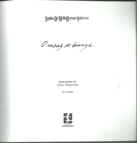 O RAPAZ DE BRONZE. *** Sophia de Mello Breyner Andresen *** Ilustrações de Júlio Resende *** Lisboa: Edições Salamandra, Lda., [Sem ind. de ano: 1994 (?) – data do Depósito Legal]. (21 x 20,5 cm.) com 37 + [3] pp. + [4] folhas com ilustrações a cores. Capa flexível. Bom exemplar. Capa com marcas de manuseamento, alguns vincos discretos e um ligeiro desgaste nas margens, mas, de um modo geral, ainda em boas condições e limpa. Páginas bem conservadas e limpas, apresentando apenas algumas manchas ténues (de reduzida importância) nas primeiras e nas últimas. *** 18.ª edição deste belo conto destinado ao público infanto-juvenil, que marcou sucessivas gerações de leitores, desde o seu aparecimento, em 1966. Numa breve nota, declara a Autora: «Muitos dos meus contos para crianças foram inspirados por praias, casas, jardins, parques e pinhais da minha infância. Assim, o “O Rapaz de Bronze” foi pela quinta da minha avó e pelos feéricos jardins, bosques, avenidas, parques e pinhais que rodeavam a casa. Mas, quando eu estava a escrever o “O Rapaz de Bronze” surgiram, aqui e acolá no enredo e em detalhes de personagens, certas reminiscências de um conto para crianças de Maurice Baring, conto que li há tantos anos que já nem sequer me lembro.» *** Portes: envio gratuito em correio normal (tarifa especial para livros) * envio em correio registado: 1,70
