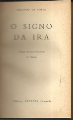 O SIGNO DA IRA. *** Orlando da Costa *** Lisboa: Editora Arcádia Limitada, 1962. (19 x 12 cm.) com 304 + [2] pp. Capa dura, com sobrecapa de papel ilustrada. Exemplar razoável. Sobrecapa envelhecida, com evidentes marcas de manuseamento, manchas (visíveis quase só na parte de dentro), algumas arranhadelas e gasta nas margens, onde apresenta vários pequenos rasgões e mesmo a falta de alguns pedaços de papel. Capa dura com algumas marcas de uso e as extremidades da lombada ligeiramente amachucadas, mas, de um modo geral, ainda em bom estado e limpa. Páginas globalmente bem conservadas e limpas, mas com um tom amarelecido (mais forte nas margens) e algumas manchas, que afectam sobretudo os cortes. *** 2.ª edição deste romance distinguido com o “Prémio Ricardo Malheiros” (na época o mais importante prémio literário português) e que é a mais emblemática obra do Autor, nascido em Moçambique, mas de origem goesa. Em Goa, precisamente, decorre a acção deste romance que capta cerca de um ano (1940-41) da vida de uma sociedade rural, então governada por Portugal. Perfilam-se no livro duas classes sociais principais: o proprietário hereditário de terras, bab Ligôr, e os seus rendeiros, trabalhadores rurais de casta inferior. Nos anos anteriores, uma seca severa colocou em risco a principal cultura da região, o arroz. A ocupação japonesa de grande parte do leste da Ásia agravou a situação, uma vez que tornou quase impossível a importação de arroz para complementar as escassas colheitas. O romance estrutura-se em torno das esperanças dos aldeões pela época de plantação secundária, a vangana. Uma boa colheita salvá-los-á da fome e determinará também o futuro dos jovens, dos idosos e dos nascituros.... Sobrecapa de Sebastião Rodrigues. *** Portes: envio gratuito em correio normal (tarifa especial para livros) * envio em correio registado: 1,70