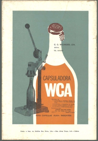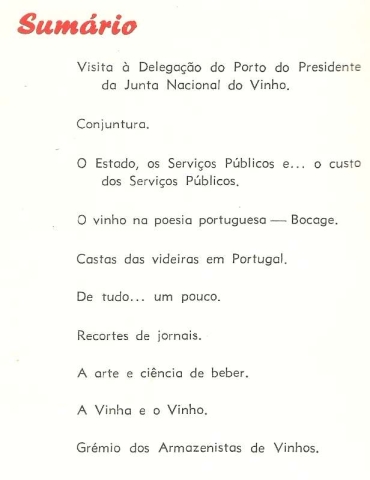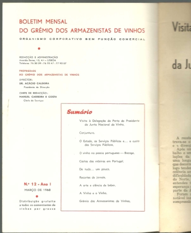 O VINHO EM PORTUGAL. Boletim Mensal do Grémio dos Armazenistas de Vinhos. N.º 12 – Ano I – Março de 1968. *** Director: Dr. Acácio Caldeira [Presidente da Direcção] *** Chefe de Redacção: Manuel Carreira e Costa [Chefe de Serviços] *** Lisboa: Grémio dos Armazenistas de Vinhos, 1968. (Comp. e Imp. na Gráfica Boa Nova, Lda. – Lisboa). (23 x 16 cm.) com 36 pp. Com algumas ilustrações (sobretudo publicidade). Capa flexível. Exemplar razoável. Capa com marcas de manuseamento, algumas manchas (mais visíveis na contracapa) e um pouco gasta nas margens e na lombada. Apesar de um pouco envelhecida, de um modo geral, está ainda em boas condições. Páginas bem conservadas e limpas, embora as primeiras e as últimas se encontrem um pouco escurecidas, certamente devido ao contacto com a parte de dentro da capa. *** Um dos números deste muito apreciado Boletim sobre temas vinícolas que, salvo melhor opinião, se publicou entre Março de 1967 e Dezembro de 1970, totalizando 45 números, hoje muito invulgares e difíceis de reunir. (Sumário deste número na imagem 4). *** Portes: envio gratuito em correio normal (tarifa especial para livros) * envio em correio registado: 1,70