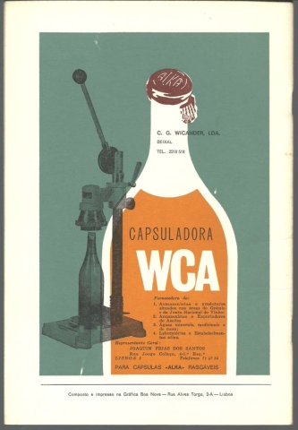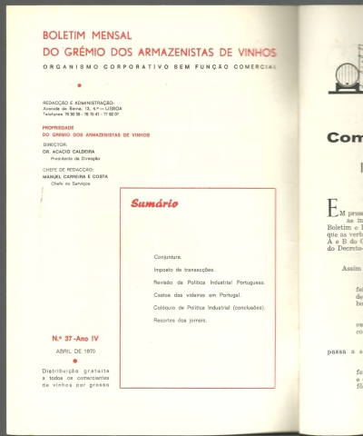 O VINHO EM PORTUGAL. Boletim Mensal do Grémio dos Armazenistas de Vinhos. [Organismo corporativo sem função comercial]. N.º 37 – Ano IV – Abril de 1970. *** Director: Dr. Acácio Caldeira [Presidente da Direcção] *** Chefe de Redacção: Manuel Carreira e Costa [Chefe de Serviços] *** Lisboa: Grémio dos Armazenistas de Vinhos, 1970. (Composto e impresso na Gráfica Boa Nova – Lisboa). (23 x 16 cm.) com [2] + 40 pp. Com algumas ilustrações (sobretudo publicidade). Capa flexível. Exemplar razoável. Capa com pequenas marcas de manuseamento, algumas manchas (de muito reduzida importância) e com um leve desgaste nas margens e na lombada, mas, globalmente, ainda em bom estado e limpa. Páginas bem conservadas e limpas, embora apresentem um ligeiro amarelecimento e uma ou outra pequena mancha (raras e de muito reduzida importância). *** Trigésimo sétimo número deste apreciado “Boletim” mensal, consagrado essencialmente a temas vinícolas, que se terá publicado ininterruptamente entre Março de 1967 e Dezembro de 1970, num total de 45 números. (Sumário deste número na imagem 4). *** Portes: envio gratuito em correio normal (tarifa especial para livros) * envio em correio registado: 1,70