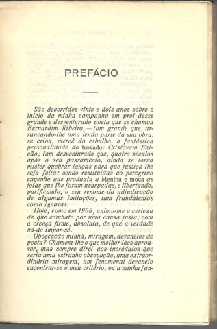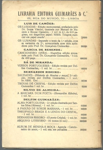 OBRAS POÉTICAS. *** Bernardim Ribeiro (1482-1552) *** Edição revista e prefaciada por Delfim Guimarães *** Lisboa: Livraria Editora Guimarães & C.ª, 1930. (19,5 x 13 cm.) com 223 + [1] pp. Capa flexível. Exemplar razoável. Capa com marcas de manuseamento, manchas ligeiras e um leve desgaste nas margens e na lombada, que se encontra também um pouco escurecida e apresenta vincos de abertura. Apesar de tudo, de um modo geral, está ainda em boas condições. Páginas globalmente bem conservadas e limpas, embora apresentem um tom amarelecido e algumas pequenas manchas, que se concentram sobretudo nas primeiras e nas últimas. As páginas estão quase totalmente ainda por abrir. *** Primeira edição desta edição revista das Obras Poéticas de Bernardim Ribeiro, que tem como intenção principal fixar com rigor o corpus poético do autor de Menina e Moça, libertando-o de algumas composições que falsamente lhe atribuíram e recuperando aquelas que certos investigadores defendem pertencer a Cristóvão Falcão, teoria que Delfim Guimarães sempre combateu com o maior empenho. Lê-se logo no início do prefácio: «São decorridos vinte e dois anos sôbre o início da minha campanha em prol dêsse grande e desventurado poeta que se chamou Bernardim Ribeiro – tam grande que, arrancando-lhe uma lenda parte da sua obra, se criou, mercê do esbulho, a fantástica personalidade do trovador Cristóvam Falcão; tam desventurado que, quatro séculos após o seu passamento, ainda se torna mister quebrar lanças para que justiça lhe seja feita; sendo restituídas ao peregrino engenho que produziu a Menina e moça as joias que lhe foram usurpadas, e libertando, purificando, o seu renome da adjudicação de algumas imitações, tam fraudulentas como ignaras. Hoje, como em 1908, anima-me a certeza de que combato por uma causa justa, com a crença firme, absoluta, de que a verdade há-de impor-se.» *** Portes: envio gratuito em correio normal (tarifa especial para livros) * envio em correio registado: 1,70