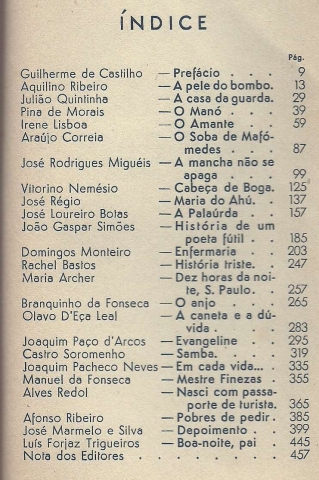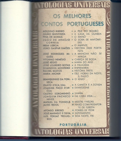 OS MELHORES CONTOS PORTUGUESES. 2.ª Série. *** [Vários Autores] *** Selecção, prefácio e notas de Guilherme de Castilho *** Lisboa: Portugália Editora, [Sem ind. de ano: provavelmente de meados da década de 1940]. Colecção: Antologias Universais; Conto – 5. (19 x 11,5 cm.) com 456 + [8] pp. Encadernado, conservando a capa e a contracapa originais. Exemplar razoável. Encadernação em material sintético vermelho, com o título e filetes ornamentais gravados a ouro na lombada (lisa). Encadernação em bom estado e limpa, com ligeiras marcas de manuseamento. Capas originais algo envelhecidas, com algumas manchas e um pouco aparadas. Páginas, de um modo geral, bem conservadas e limpas, embora apresentem um tom amarelecido e algumas pequenas manchas de acidez, pouco frequentes. *** 2.ª edição (praticamente igual à primeira) da segunda série desta antologia dos melhores contos portugueses, onde o responsável pela selecção procurou reunir os nomes mais representativos dos escritores portugueses vivos [à época da primeira edição do livro (c. 1945)] que à novela e ao conto se dedicaram, destacando de cada um o conto ou a novela que, de uma maneira geral e no seu entender, lhe «pareceu dar melhor a medida dos méritos literários do respectivo autor.» (Índice na imagem 4). *** Portes: envio gratuito em correio normal (tarifa especial para livros) * envio em correio registado: 1,70