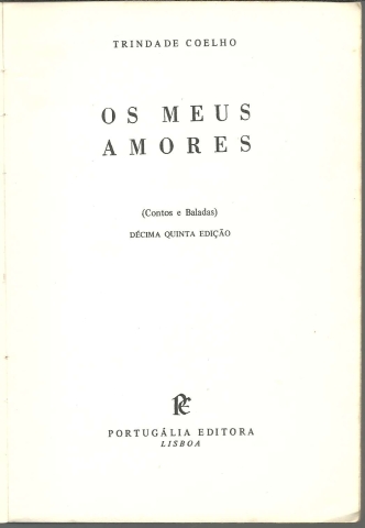 OS MEUS AMORES. (Contos e Baladas). *** Trindade Coelho *** Lisboa: Portugália Editora, 1971. (19 x 13 cm.) com 381 + [3] pp. Capa flexível. Exemplar razoável. Capa com marcas de manuseamento, pequenas perdas de cor em alguns pontos, manchas (mais concentradas na contracapa), vincos e um pouco gasta nas margens e na lombada, que apresenta também vincos de abertura. Globalmente, apesar de envelhecida e um pouco cansada, está ainda apresentável. Páginas em relativo bom estado, embora apresentem um ligeiro amarelecimento, uma ou outra mancha (pouco frequentes e de reduzida importância) e as primeiras e as últimas se encontrem escurecidas e com manchas de acidez, certamente devido ao contacto com a parte de dentro da capa. Também os cortes se encontram um pouco escurecidos e com pequenas manchas. *** 15.ª edição desta que é considerada a obra-prima de Trindade Coelho e um dos melhores livros de contos da literatura portuguesa. Originalmente publicado em 1891 e muito aumentado na terceira edição de 1901, a última publicada em vida do Autor, apresenta um conjunto de contos que evocam, de forma saudosista, a vida rural e o ambiente transmontano onde o Autor cresceu. *** Portes: envio gratuito em correio normal (tarifa especial para livros) * envio em correio registado: 1,70