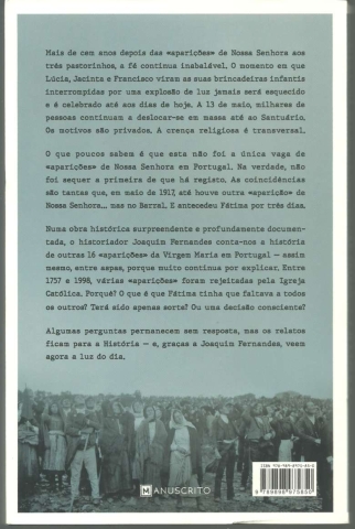 AS OUTRAS «FÁTIMAS». As «aparições da Virgem Maria» em Portugal que a Igreja Católica não reconhece. *** Joaquim Fernandes *** Lisboa: Manuscrito, 2021. (23 x 15 cm.) com 253 + [3] pp. Com várias ilustrações a p/b.. Capa flexível, com badanas. Bom exemplar. Capa com mínimas marcas de manuseamento, encontrando-se em bom estado e limpa. Páginas bem conservadas e limpas. Conserva o marcador de páginas próprio da edição. *** Primeira edição desta muita interessante obra que aborda um assunto desconhecido da maioria das pessoas: as várias “aparições de Nossa Senhora” em Portugal, mas que não foram reconhecidas pela Igreja católica. Lê-se na contracapa: «Numa obra histórica surpreendente e profundamente documentada, o historiador Joaquim Fernandes conta-nos a história de outras 16 «aparições» da Virgem Maria em Portugal – assim mesmo, entre aspas, porque muito continua por explicar. Entre 1757 e 1998, várias «aparições» foram rejeitadas pela Igreja Católica. Porquê? O que é que Fátima tinha que faltava a todos os outros? Terá sido apenas sorte? Ou uma decisão consciente? Algumas perguntas permanecem sem resposta, mas os relatos ficam para a História – e, graças a Joaquim Fernandes, veem agora a luz do dia.» (Índice nas imagens 3 e 4). *** Portes: envio gratuito em correio normal (tarifa especial para livros) * envio em correio registado: 1,70