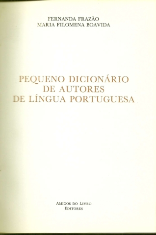 PEQUENO DICIONÁRIO DE AUTORES DE LÍNGUA PORTUGUESA. *** Fernanda Frazão – Maria Filomena Boavida *** [Lisboa]: Amigos do Livro Editores, [Sem ind. de ano: 1983 – data do copyright]. (22,5 x 15,5 cm.) com 418 + [6] pp. Com algumas ilustrações (quase só retratos de escritores). Capa dura. Bom exemplar. Capa globalmente bem conservada e limpa, apresentando apenas algumas marcas de manuseamento e alguns pontos nas margens e nas extremidades da lombada ligeiramente amachucados. Páginas em bom estado e limpas. *** Primeira e provavelmente única edição deste muito útil dicionário que procura fornecer os dados biobibliográficos essenciais sobre os mais importantes escritores de língua portuguesa. *** Portes: envio gratuito em correio normal (tarifa especial para livros) * envio em correio registado: 1,70