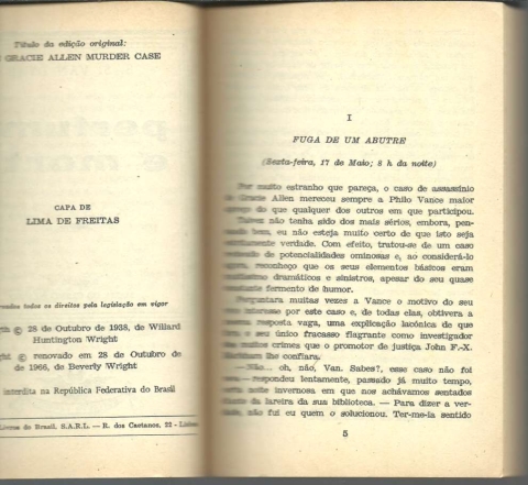 PERFUME E MORTE. *** S. S. Van Dine *** Tradução de Maria do Carmo Pizarro *** Título da edição original: The Gracie Allen Murder Case *** Lisboa: Edição «Livros do Brasil», [Sem ind. de ano: 1975 (?)]. Colecção Vampiro – 340. (16 x 10,5 cm.) com 173 + [3] + IV + [4] pp. Capa flexível. Exemplar razoável. Capa com marcas de manuseamento, vincos muito discretos, pequenas perdas de cor em alguns pontos e um ligeiro desgaste nas margens e na lombada, mas, de um modo geral, ainda em bom estado e limpa. Páginas bem conservadas e limpas, embora apresentem um tom amarelecido, próprio do papel. *** Presumível primeira edição portuguesa deste romance policial, originalmente publicado em 1938, e que, cronologicamente é o décimo primeiro de doze romances de S. S. Van Dine protagonizados pelo seu famoso dectetive Philo Vance. O Autor, de acordo com o crítico Arnold Palmer, é um dos melhores escritores de literatura policial, destacando-se pelo seu engenho extraordinário e a sua capacidade de elaboração e descrição inteligente de intrigas que prendem o leitor até à derradeira página de cada romance. Capa de Lima de Freitas. *** Portes: envio gratuito em correio normal (tarifa especial para livros) * envio em correio registado: 1,70