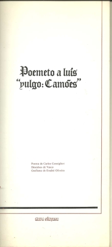 POEMETO A LUÍS “VULGO: CAMÕES”. *** Poema de Carlos Consiglieri *** Desenhos de Vasco *** Grafismo de Ernâni Oliveira *** [Sem ind. de local: Lisboa (?)]: Nova Síntese, 1980. (Gabinete Técnico de Artes Visuais). Colecção Nova Síntese [dirigida por Marília Abel]. (30,5 x 16 cm.) com uma folha dobrada em cinco partes, formando como que dez páginas. Com quatro ilustrações a p/b. Capa flexível, fomando uma espécie de pasta em tríptico com uma badana na terceira parte. Exemplar razoável. Capa com marcas de manuseamento, manchas, vincos, perdas de cor em algumas pequenas áreas e um pouco gasta nas margens, que se encontram também ligeiramente amachucadas em alguns pontos. Tem uma pequena etiqueta de distribuidora de livros colada na parte de dentro. Apesar de um pouco envelhecida, está ainda apresentável. A folha/páginas está em bom estado e limpa. *** Primeira e provavelmente única edição deste poema publicado por ocasião do 4.º Centenário do falecimento de Camões e que, um pouco em contracorrente, num momento de grandes festividades e cerimoniais, e à semelhança do que já fizera, por exemplo, Gomes Leal, cem anos antes, em A Fome de Camões, procura dar do poeta uma imagem dessacralizada, desmitificada e desglorificada, profundamente humana. Livro muito invulgar e curioso. *** Portes: envio gratuito em correio normal (tarifa especial para livros) * envio em correio registado: 1,70