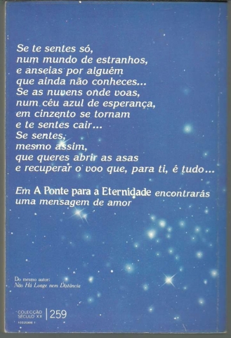 A PONTE PARA A ETERNIDADE. *** Richard Bach *** Título original: The Bridge across Forever *** Tradução de Carolina de Oliveira *** Mem Martins: Publicações Europa-América, [Sem ind. de ano: 1986]. Colecção Século XX – 259. (21 x 14 cm.) com 240 pp. Capa flexível. Exemplar razoável. Capa com marcas de manuseamento, alguns vincos discretos, pequenas manchas de acidez (pouco importantes e só visíveis no lado de dentro) e um pouco gasta nas margens. Apesar de ligeiramente envelhecida, de um modo geral, está ainda em boas condições e limpa. Páginas bem conservadas e limpas, embora apresentem um tom amarelecido (um pouco mais forte nas margens), próprio do papel. *** Primeira edição portuguesa deste livro, um dos mais conhecidos do célebre autor da História de Fernão Capelo Gaivota, onde Richard Bach explora o significado da vida, do destino e das almas gémeas, construindo uma espécie de conto de fadas moderno, inspirado na sua relação com a actriz norte-americana Leslie Parrish. «Esta é a história de um cavaleiro que estava a morrer e da princesa que lhe salvou a vida», escreve o Autor no texto de apresentação. «É uma história de belezas, animais, feitiços e fortalezas, de poderes mortíferos aparentes e poderes criadores reais.» É tudo isso e bastante mais. No plano da realidade, trata-se fundamentalmente do fascinante caso de amor entre duas pessoas plenamente humanas que estão dispostas a explorar dimensões astrais, metafísicas em conjunto, ao mesmo tempo que se debatem com as lutas terrenas da intimidade, do compromisso, da asfixia... e de pequenas disputas domésticas. O caso de amor de Bach e Parrish, com o seu final feliz, inspirou muitos leitores entusiasmados. Anos mais tarde, no entanto, algumas dessas pessoas ficariam devastadas ao descobrirem que este casamento feito no céu não resultou (o casal separou-se em 1999). Mas numa entrevista posterior, Bach explicou que os amantes não precisam de permanecer casados para sempre para serem almas gémeas para a vida... *** Portes: envio gratuito em correio normal (tarifa especial para livros) * envio em correio registado: 1,70