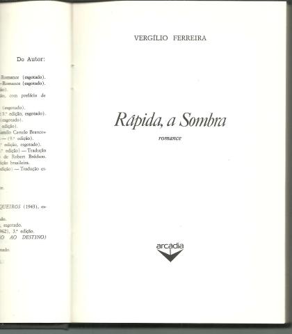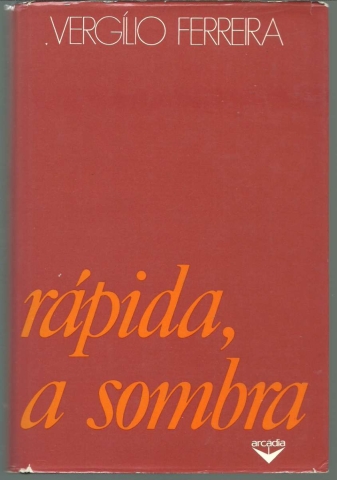 RÁPIDA, A SOMBRA. Romance. *** Vergílio Ferreira *** [Lisboa]: Arcádia, 1975. Colecção: Biblioteca Arcádia; Obras de Vergílio Ferreira. (21 x 14 cm.) com 274 + [2] pp. Capa dura, com sobrecapa de papel. Exemplar razoável. Capa com marcas de manuseamento, alguns vincos de pressão e um pouco gasta e amachucada nas margens, que apresentam mesmo alguns pequenos rasgões (de reduzida importância). Na parte de trás tem um pequeno corte, aparentemente feito com um objecto pontiagudo, mas que não atinge a capa dura. Apesar de tudo, de um modo geral, está ainda muito apresentável. Capa dura com pequenas marcas de manuseamento e as extremidades da lombada um pouco amachucadas, mas, de um modo geral, ainda em bom estado e limpa. Páginas bem conservadas e limpas. *** Primeira edição de uma das marcantes obras de Vergílio Ferreira, sobre a qual escreveu José Rodrigues de Paiva: «Como Nítido Nulo, Rápida, a Sombra é um romance construído sob o signo da ironia. Os corifeus da política, da História, da ciência, da arte, profetas ou senhores absolutos da verdade existentes em todos os quadrantes do mundo, são vistos de forma a deixar patente a falsidade das suas crenças e a ausência de sinceridade nas suas posições. A própria situação do narrador é profundamente irónica. (...) Mas o sentido irónico de Rápida, a Sombra estende-se à sua própria estruturação, o que se percebe ao final do romance, no último capítulo, espécie de chave para a interpretação da obra, quando se descobre o logro em que o leitor é mantido durante todo o desenrolar do livro, acreditando que o narrador fora efectivamente abandonado por sua mulher, que afinal regressa pela noite, algumas horas depois de haver saído.» *** Portes: envio gratuito em correio normal (tarifa especial para livros) * envio em correio registado: 1,70