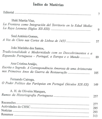 REVISTA DE HISTÓRIA DA SOCIEDADE E DA CULTURA – 4. *** [Iñaki Martin Viso (La Frontera como Integración del Territorio en la Edad Media: La Raya Leonesa (Siglos XII-XIII)) – Saul António Gomes (A Vox do Clero nas Cortes de Lisboa de 1455) – João Marinho dos Santos (Tradicionalidade e Modernidade com os Descobrimentos e a Expansão Portuguesa – Portugal, a Europa e o Mundo) – Ana Cristina Araújo (Escrita e Segredo. A Correspondência Amorosa de uma Aristocrata nos Primeiros Anos da Guerra da Restauração) – Fernando Catroga (O Poder Político das Paróquias em Portugal (Séculos XIX-XX)) – A. H. de Oliveira Marques (Rumos da Historiografia Portuguesa)] *** Propriedade: Centro de História da Sociedade e da Cultura *** Direcção: João Marinho Santos – Coordenador Científico do Centro de História da Sociedade e da Cultura; António Oliveira – Coordenador do projecto: História da Região Centro de Portugal; Maria Helena da Cruz Coelho – Coordenadora do projecto: Sociedades, Poderes e Culturas: Portugal e os “Outros”. *** Coordenador do número 4: Ana Cristina Araújo *** Conselho de Redacção: Ana Cristina Araújo; António Martins da Silva; António de Oliveira; Fernando Catroga; Fernando Taveira da Fonseca; Guilhermina Mota; Hans-Richard Jahnke; Irene Maria Vaquinhas; João Gouveia Monteiro; João Marinho dos Santos: João Nunes de Oliveira; José Antunes; José Manuel Azevedo e Silva; José Pedro Paiva; Leontina Ventura; Luís Ferrand de Almeida; Manuel Augusto Rodrigues; Maria Alegria Fernandes Marques; Maria Antónia Lopes; Maria Helena da Cruz Coelho; Maria José Azevedo Santos; Margarida Sobral Neto; Rosa Marreiros; Maria Teresa Nobre Veloso; Mário Santiago de Carvalho; Rui de Ascensão Ferreira Cascão; Saul António Gomes. *** Coimbra: Centro de História da Sociedade e da Cultura / Viseu: Palimage Editores, 2004. (23 x 16 cm.) com 321 + [3] pp. Com algumas ilustrações a p/b.. Capa flexível. Exemplar razoável. capa com marcas de manuseamento, alguns vincos discretos e um pequeno desgaste nas margens, mas, de um modo geral, ainda em boas condições e limpa. Páginas bem conservadas e limpas, apresentando apenas um ou outro pontinho de acidez (raros e de muito reduzida importância). *** Número 4 desta revista, que tem por tema genérico o “território”, entendido, não absolutamente como espaço geográfico (ainda que com fronteiras definidas), antes considerando-o, também, como forma de organização (político-administrativa, económica, religiosa, sócio-cultural...), propondo novas vias de abordagem deste assunto e a propósito de situações concretas. (Índice na imagem 4). *** Portes: envio gratuito em correio normal (tarifa especial para livros) * envio em correio registado: 1,70