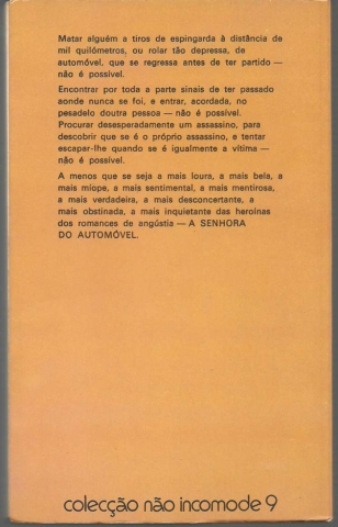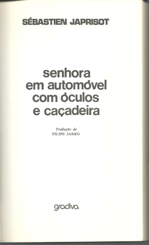 SENHORA EM AUTOMÓVEL COM ÓCULOS E CAÇADEIRA. *** Sébastien Japrisot *** Tradução de Filipe Jarro *** Título do original francês: La Dame dans L’auto avec des Lunetes et un fusil *** Revisão de texto: Manuel Joaquim Vieira *** Lisboa: Gradiva – Publicações. Lda., 1984. Colecção Não Incomode – 9. (20 x 12,5 cm.) com 252 + [4] pp. Capa flexível, com badanas. Exemplar razoável. Capa com marcas de manuseamento, alguns pequenos vincos e um ligeiro desgaste nas margens e na lombada, que apresenta também vincos de abertura. Apesar de evidenciar algum uso, de um modo geral, está ainda em boas condições e limpa. Páginas bem conservadas e limpas. *** Primeira edição portuguesa deste romance policial originalmente publicado em 1966 e que conta já com duas adaptações cinematográficas. Capa de Pedro Saraiva. *** Portes: envio gratuito em correio normal (tarifa especial para livros) * envio em correio registado: 1,70