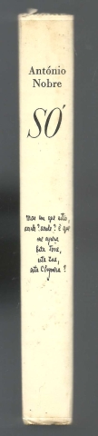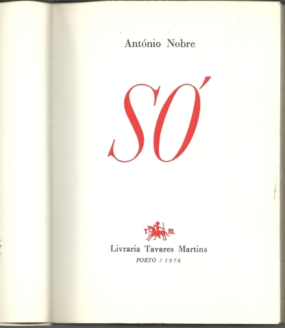 SÓ. *** António Nobre *** Porto: Livraria Tavares Martins, 1976. (22 x 15,5 cm.) com 219 + [5] pp + [6] folhas com reproduções fac-similadas de provas tipográficas emendadas pelo Autor. Capa flexível, com badanas. Exemplar razoável. Capa com pequenas marcas de manuseamento e algumas manchas, mas, de um modo geral, ainda em bom estado e limpa. A capa está, no entanto, protegida por uma espécie de sobrecapa de plástico transparente, que foi fixada nas extremidades laterais com fita-cola na parte de dentro das badanas, o que provocou manchas nas badanas e, mais evidentes, na parte de dentro da capa, por debaixo das badanas. Páginas globalmente bem conservadas e limpas, apresentando apenas uma ou outra pequena mancha (raras). *** 17.ª edição de um dos livros fundamentais da poesia portuguesa, continuamente reeditado desde a sua publicação original, em 1892. Edição em bom papel. *** Portes: envio gratuito em correio normal (tarifa especial para livros) * envio em correio registado: 1,70