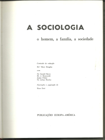 A SOCIOLOGIA. O Homem, a Família, a Sociedade. *** Comissão de redacção: Dr.ª Mary Douglas com Sir Gerald Barry – Dr. J. Bronowski – James Fischer – Sir Julian Huxley *** Ilustrações e paginação de Hans Erni *** Prefácio: James Fisher [Director editorial de Aldus Books] *** Título original: Man in Society *** Tradução de Maria A. Conde Rodo, Mário A. Matos e Lemos e Gervásio Álvaro *** Revisão tipográfica de Manuel J. Vieira *** [Sem ind. de local: Lisboa (?)]: Publicações Europa-América, 1967. Colecção: O Mundo do Homem – 3. (27,5 x 20,5 cm.) com 366 + [2] pp. Profusamente ilustrado a cores e a p/b.. Capa dura, com sobrecapa de papel ilustrada. Bom exemplar. Sobrecapa com marcas de manuseamento, algumas pequenas manchas (só visíveis na parte de dentro) e um pequeno desgaste nas margens, mas, de um modo geral, ainda em bom estado e limpa. Capa dura com pequenas marcas de uso, mas, de um modo geral, ainda bem conservada e limpa. Páginas em bom estado e limpas, apresentando, no entanto, um ligeiro amarelecimento e uma ou outra mancha (raras e de pequena importância). *** Primeira edição portuguesa do terceiro volume de “O Mundo do Homem – uma enciclopédia por assuntos em dez volumes”, consagrado à Sociologia e contendo «todos os temas fundamentais da vida social examinados na sua evolução, através de uma síntese impecável.» *** Portes: envio gratuito em correio normal (tarifa especial para livros) * envio em correio registado: 1,70