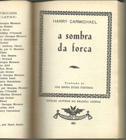 A SOMBRA DA FORCA. *** Harry Carmichael *** Tradução de Ana Maria Syder Fontinha *** Título da edição original: «Noose for a Lady» *** Lisboa: Edição «Livros do Brasil», 1985. Colecção Vampiro – 461. (16 x 10,5 cm.) com 221 + [3] pp. Capa flexível. Exemplar razoável. Capa com marcas de manuseamento, vincos, pequenas perdas de cor em alguns pontos e um ligeiro desgaste nas margens e na lombada, mas, de um modo geral, ainda em bom estado e limpa. Páginas bem conservadas e limpas, embora apresentem um tom amarelecido, próprio do papel. *** Presumível primeira edição portuguesa deste romance, originalmente publicado em 1955, do escritor britânico, de origem canadiana, Leopold Ognall, que ficou conhecido pelos pseudónimos de Hartley Howard e Harry Carmichael, com os quais assinou quase uma centena de romances policiais. Capa de A. Pedro. *** Portes: envio gratuito em correio normal (tarifa especial para livros) * envio em correio registado: 1,70