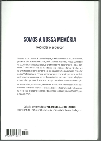 SOMOS A NOSSA MEMÓRIA. Recordar e Esquecer. *** Emilio García García *** Título original: Somos nuestra memoria. Recordar y olvidar *** Tradução: Ivan Felgueiras *** Revisão científica: Susana Carnapete *** Revisão: Teresa Souto *** [Sem ind. de local: Lisboa]: Atlântico Press, [Sem ind. de ano: 2019 (?) – data do copyright]. [Obra editada em Portugal em exclusivo para Cofina Media SA]. Colecção: Neurociência & Psicologia – [1]. (23,5 x 16,5 cm.) com 140 + [4] pp. Com algumas ilustrações a p/b.. Capa dura. Exemplar razoável. Capa com marcas de manuseamento e tendo na margem superior da capa da frente uma pequena área ligeiramente amachucada, mas, de um modo geral, ainda em bom estado e limpa. Páginas globalmente bem conservadas, mas com algumas pequenas manchas (quase só nas folhas de guarda e nos cortes). A primeira página de texto apresenta, no entanto alguns trechos sublinhados com esferográfica azul. *** Primeira edição portuguesa do volume inaugural da colecção Neurociência & Psicologia, apresentada pelo neurocientista Alexandre Castro Caldas, Professor catedrático da Universidade Católica Portuguesa. «No presente livro, abordaremos, através de investigações e dos casos clínicos mais relevantes, os diversos sistemas de memória exigidos pela complexidade multifacetada da nossa vida, os seus mecanismos subjacentes e as consequências das alterações que podem sofrer.» (Índice nas imagens 3 e 4). *** Portes: envio gratuito em correio normal (tarifa especial para livros) * envio em correio registado: 1,70
