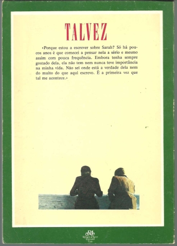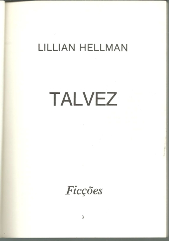 TALVEZ. *** Lillian Hellman *** Título original: Maybe *** Tradução: Carlos Leite *** Lisboa: Relógio d’Água Editores Lda., 1984. Colecção: Ficções. (20,5 x 14,5 cm.) com 71 + [1] pp. Capa flexível. Exemplar razoável. Capa com marcas de manuseamento, pequenas perdas de cor em alguns pontos, manchas ligeiras e um pouco gasta nas margens e na lombada. Globalmente, apesar de evidenciar algum uso e envelhecimento, está ainda muito apresentável. Páginas em bom estado e limpas, apresentando apenas um ligeiro amarelecimento, próprio do papel. Tem, no entanto, um carimbo de posse na primeira página (anterrosto) que ficou também parcialmente espelhado na parte de dentro da capa da frente. *** Primeira edição portuguesa deste livro de difícil classificação, que constitui uma evocação complexa de factos e personalidades que tiveram uma existência real e marcaram mais ou menos acidentalmente a vida da Autora e que são por ela reconstruídos num mosaico inconsistente de fantasia, falsidades deliberadas e até de alguma perversidade. *** Portes: envio gratuito em correio normal (tarifa especial para livros) * envio em correio registado: 1,70