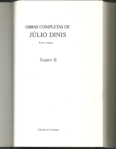 TEATRO II. *** Júlio Dinis *** Lisboa: Círculo de Leitores, Lda., 1979. Colecção: Obras Completas de Júlio Dinis – 6. (20,5 x 12,5 cm.) com 379 + [3] pp. Capa dura. Bom exemplar. Capa com pequenas marcas de manuseamento, encontrando-se em bom estado e limpa. Páginas bem conservadas e limpas, apresentando apenas um ligeiro amarelecimento, próprio da passagem do tempo. *** Primeira edição na colecção do segundo volume de Teatro de Júlio Dinis, reunindo as peças: «Um Rei Popular» (Drama original em dois actos), de 1858; «Um Segredo de Família» (Comédia original em três actos), de 1860 e «A Educanda de Odivelas» (Comédia original em dois actos), de 1860. *** Portes: envio gratuito em correio normal (tarifa especial para livros) * envio em correio registado: 1,70