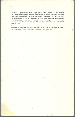 TRATADO DA CIDADE DE PORTALEGRE. *** Diogo Pereira de Sotto Maior *** Introdução, leitura e notas de Leonel Cardoso Martins *** [Lisboa]: Imprensa Nacional – Casa da Moeda / [Portalegre]: Câmara Municipal de Portalegre, 1984. Colecção: Temas portugueses. (24 x 15 cm.) com 155 + [13] pp. Com algumas ilustrações a p/b.. Capa flexível. Exemplar razoável. Capa com marcas de manuseamento, algumas manchas, vincos (inclusive de pressão), pequenas perdas de cor em alguns pontos e com um ligeiro desgaste nas margens e na lombada. Globalmente, apesar de um pouco envelhecida, está ainda bastante apresentável. Páginas, de um modo geral, bem conservadas e limpas, embora as primeiras e as últimas apresentem algumas manchas de acidez (algo ténues), sobretudo junto das margens e certamente devidas ao contacto com a parte de dentro da capa. Também os cortes apresentam algumas pequenas manchas. *** Trata-se, no fundo da primeira edição comercial (antes, apenas havia sido feita, em 1919, uma edição de 165 exemplares na tipografia de António José Torres de Carvalho, em Elvas, por iniciativa do bibliófilo e investigador Luís Keil) de um manuscrito do início do século XVII, redigido pelo Padre Diogo Pereira Sotto Maior e que constitui provavelmente a primeira história da cidade de Portalegre. Lê-se na Introdução: “Em 1616, «detrás das costas da capela de S. Tiago», concluiu o Padre Diogo Pereira Sotto Maior, «indigno capelão em a Santa Sé», o seu Tratado da Cidade de Portalegre. Recolha de tradições e lendas, relato de factos de que teve conhecimento ou que ele próprio presenciou, de tudo foi guardando memória escrita em «cadernos, borrões e cartapácios». Desses materiais dispersos, e satisfazendo o interesse manifestado pelo bispo D. Rodrigo da Cunha, resultou o Tratado, que lhe dedicou e ofereceu pelo Natal desse ano de 1616.” (Índice nas imagens 3 e 4). *** Portes: envio gratuito em correio normal (tarifa especial para livros) * envio em correio registado: 1,70