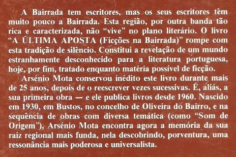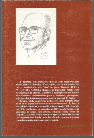 A ÚLTIMA APOSTA. (Ficções na Bairrada). *** Arsénio Mota *** Lisboa: Livros Horizonte, Lda., [1987]. Colecção Encontro – 11. (21 x 14 cm.) com 102 + [2] pp. Capa flexível. Exemplar razoável. Capa com marcas de manuseamento, algo descolorida em alguns pontos e um pouco gasta nas margens e na lombada, mas, de um modo geral, ainda bastante apresentável. Páginas bem conservadas e limpas, embora apresentem um ligeiro amarelecimento, próprio do papel e da passagem do tempo. *** Primeira edição deste livro a propósito do qual se lê na contracapa: «A Bairrada tem escritores, mas os seus escritores têm muito pouco a Bairrada. Esta região, por outra banda tão rica e caracterizada, não “vive” no plano literário. O livro “A Última Aposta (Ficções na Bairrada)” rompe com esta tradição de silêncio. Constitui a revelação de um mundo estranhamente desconhecido para a literatura portuguesa, hoje, por fim, tratado enquanto matéria possível de ficção. Arsénio Mota conservou inédito este livro durante mais de 25 anos, depois de o reescrever vezes sucessivas. É, aliás, a sua primeira obra – e ele publica livros desde 1960. Nascido em 1930, em Bustos, no concelho de Oliveira do Bairro, e na sequência de obras com diversa temática (como “Som de Origem”), Arsénio Mota encontra agora a memória da sua raiz regional mais funda, nela descobrindo, porventura, uma ressonância mais poderosa e universalista.». *** Portes: envio gratuito em correio normal (tarifa especial para livros) * envio em correio registado: 1,70