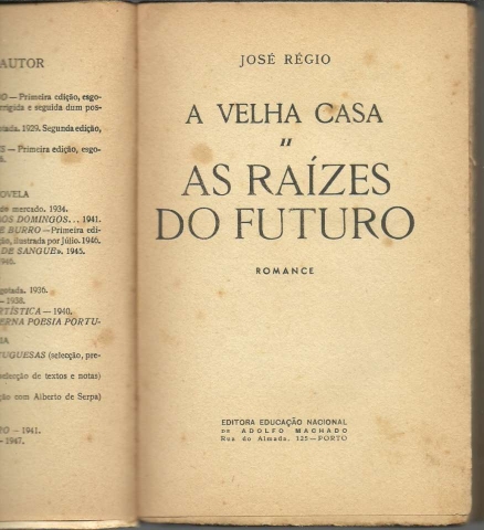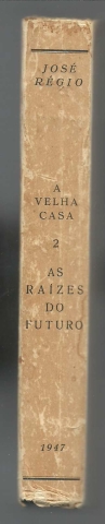 A VELHA CASA – II: AS RAÍZES DO FUTURO. Romance. *** José Régio *** Porto: Editora Educação Nacional – de Adolfo Machado, 1947. (19 x 12,5 cm.) com 302 + [2] pp. Capa flexível, com pequenas badanas. Exemplar razoável. Capa com marcas de manuseamento, um pouco manchada e empoeirada e algo gasta nas margens e na lombada, que apresenta também vincos de abertura. Apesar de acusar o uso e algum envelhecimento, globalmente está ainda apresentável. Páginas em relativo bom estado, embora apresentem um tom amarelecido e algumas manchas de acidez desigualmente distribuídas, pouco ou nada afectando a maioria e concentrando-se em algumas (sobretudo no início e no final). *** Primeira edição do segundo romance do ciclo “A Velha Casa” (cinco romances publicados entre 1945 e 1966), que José Régio considerou a sua mais importante obra de ficção e «uma meditação sobre a vida humana, sobre a condição humana». Pouco comum. *** Portes: envio gratuito em correio normal (tarifa especial para livros) * envio em correio registado: 1,70