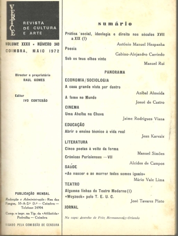 VÉRTICE. Revista de Cultura e Arte. Volume XXXII – Número 340 – Coimbra, Maio 1972. *** Director e proprietário: Raul Gomes *** Editor: Ivo Cortesão *** [Vários Autores] *** Coimbra: Vértice, 1972. (Comp. e impr. na Tip. da «Atlântida» – Pedrulha – Coimbra). (22 x 16 cm.) com [96] pp. (numeradas de [1]-334 a 425 + [3]). Com algumas ilustrações a p/b.. Capa flexível. Exemplar razoável. Capa com marcas de manuseamento, algumas pequenas manchas, vincos muito discretos e um ligeiro desgaste nas margens e na lombada, mas, de um modo geral, ainda bem conservada e limpa. Páginas bem conservadas e limpas, embora apresentem um tom amarelecido e algumas manchas ténues de acidez, tudo próprio do papel. *** Número 340 desta importante revista mensal coimbrã, que acolheu nas suas páginas colaboração literária inédita e importantes artigos sobre os mais diversos ramos do saber, maioritariamente assinados por personalidades cimeiras do mundo cultural português. (Sumário na imagem 4). *** Portes: envio gratuito em correio normal (tarifa especial para livros) * envio em correio registado: 1,70