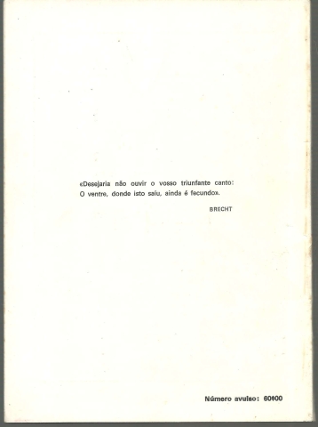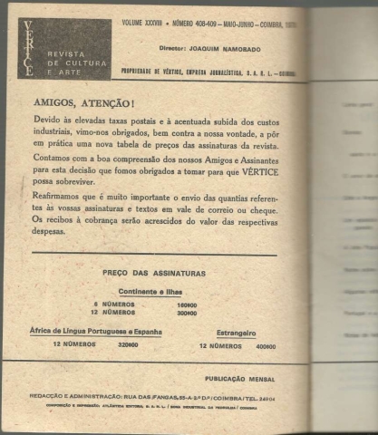 VÉRTICE. Revista de Cultura e Arte. Vol. XXXVIII – Número 408-409 – Maio-Junho – Coimbra, 1978. *** Director: Joaquim Namorado *** [Vários Autores] *** Coimbra: Vértice, Empresa Jornalística, S. A. R. L., 1978. (22 x 16 cm.) com [98] pp. (numeradas de [1]-241 a 338). Capa flexível. Exemplar razoável. Capa com marcas de manuseamento, algumas manchas ligeiras e um pequeno desgaste nas margens e na lombada, que apresenta também um rasgão na base, que foi fixado com cola. Apesar de tudo, de um modo geral, está ainda em boas condições e globalmente limpa. Páginas bem conservadas e limpas, embora apresentem um ligeiro amarelecimento e um ou outro pontinho de acidez (raros), tudo próprio do papel. *** Número duplo da revista mensal Vértice, preenchido por contos, poemas, ensaios e artigos críticos, merecendo, talvez, destaque, os vários poemas inéditos de Joaquim Namorado ou um artigo de Alexandre Cabral de interesse camiliano. (Sumário na imagem 4). *** Portes: envio gratuito em correio normal (tarifa especial para livros) * envio em correio registado: 1,70