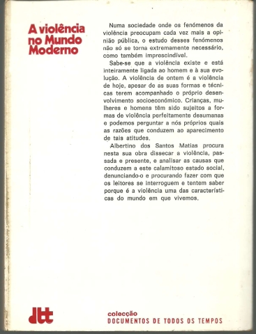 A VIOLÊNCIA NO MUNDO MODERNO. *** Albertino dos Santos Matias *** Amadora: Livraria Bertrand, 1978. Colecção: Documentos de Todos os Tempos. (20 x 15 cm.) com [-1] 331 + [1] pp. Capa flexível. Exemplar razoável. Capa com marcas de manuseamento, vincos discretos, manchas ligeiras e um pequeno desgaste nas margens e na lombada, mas, de um modo geral, ainda bastante apresentável. Páginas globalmente bem conservadas e limpas, embora apresentem um tom amarelecido (um pouco mais forte nas margens) e algumas manchas ténues de acidez (raras e de muito reduzida importância. Tem, no entanto, uma dedicatória manuscrita no anterrosto que, embora a assinatura seja praticamente ilegível, julgo que não terá sido escrita pelo Autor. Falta a primeira folha (provavelmente em branco). *** Primeira edição deste estudo sobre as origens e as manifestações das várias formas de violência nas sociedades contemporâneas. Lê-se na contracapa: «Numa sociedade onde os fenómenos da violência preocupam cada vez mais a opinião pública, o estudo desses fenómenos não só se torna extremamente necessário, como também imprescindível. Sabe-se que a violência existe e está inteiramente ligada ao homem e à sua evolução. A violência de ontem é a violência de hoje, apesar de as suas formas e técnicas terem acompanhado o próprio desenvolvimento socioeconómico. Crianças, mulheres e homens têm sido sujeitos a formas de violência perfeitamente desumanas e podemos perguntar a nós próprios quais as razões que conduzem ao aparecimento de tais atitudes. Albertino dos Santos Matias procura nesta sua obra dissecar a violência, passada e presente, e analisar as causas que conduzem a este calamitoso estado social, denunciando-o e procurando fazer com que os leitores se interroguem e tentem saber porque é a violência uma das características do mundo em que vivemos.» *** Portes: envio gratuito em correio normal (tarifa especial para livros) * envio em correio registado: 1,70