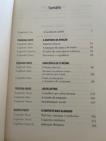 Ao longo de mais de duas décadas, o psicólogo e jornalista Daniel Goleman tem-nos mostrado o que há de inovador, surpreendente e importante nas ciências humanas. Neste livro, aborda todas as especificidades da ciência da atenção, promovendo um debate há muito adiado sobre este pouco conhecido e subvalorizado recurso mental que assume uma importância enorme para a maneira como vivemos a nossa vida. O funcionamento da atenção assemelha-se muito à de um músculo: se a utilizarmos mal, definha; se a trabalharmos bem, desenvolve-se. Numa época de distrações inesgotáveis, Goleman argumenta persuasivamente que agora, mais do que nunca, devemos aprender a apurar o nosso foco se queremos lidar com, e ser bem-sucedidos num mundo complexo