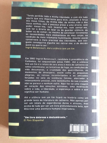 Livro "Até o Silêncio Tem um Fim" da autora colombiana Ingrid Betancourt, editado pela Editora Objectiva em fevereiro de 2011 na língua portuguesa. Mede 158 x 232 x 29 mm, tem capa mole e 632 páginas. Barato para desocupar. Negociável, vendo pela melhor oferta. Possibilidade de entrega em mão.