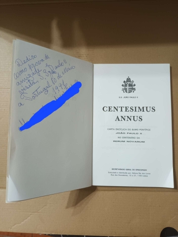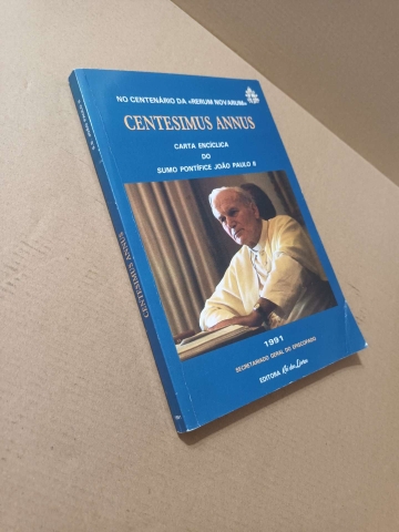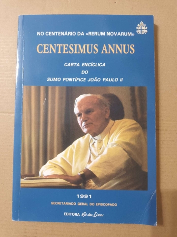 Livro "Centesimus Annus - Carta Encíclica do Sumo Pontífice João Paulo II". Centesimus Annus é uma encíclica escrita pelo Papa João Paulo II em 1991, por ocasião do centenário da publicação da encíclica Rerum Novarum pelo Papa Leão XIII. Editado pela editora Rei dos Livros com aprovação do Secretariado Geral do Episcopado no ano de 1991, Lisboa. Mede 205 mm x 140 mm, tem 128 páginas e capa mole. Possui uma dedicatória na folha de rosto. Está estimado. Barato para desocupar. Negociável, vendo pela melhor oferta. Possibilidade de vir buscar em mão.