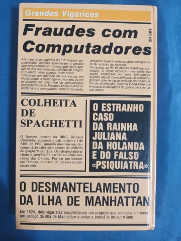Livro "Grandes vigarices" do autor Nigel Blundell, edição do Círculo de Leitores em setembro de 1987. Tem formato de bolso medindo 20 cm x 12,5 cm, 233 páginas e capa dura. Ilustrado com fotografias a preto e branco nos textos. Está em muito bom estado. Barato para desocupar. Negociável, vendo pela melhor oferta. Possibilidade de vir buscar em mão.
