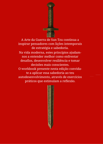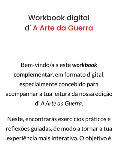 Após terminares um capítulo da nossa edição d’A Arte da Guerra, basta dirigires-te à página correspondente a este no workbook. Não te preocupes, o número da página ser-te-á dito no fim de cada capítulo. Podes, ainda, descobr7ir a página através do índice. Nada te impede de te aventurares por esta brilhante jornada.