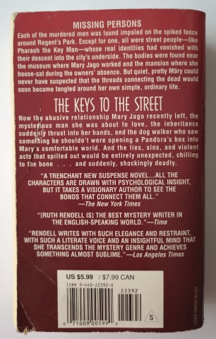 Keys to the Street is a 1996 detective novel by British author Ruth Rendell. Set in and around London's Regent's Park, where the city's wealthiest, poorest, kindest, and most vicious citizens all cross paths, The Keys to the Street tells of the deadly thanks a young woman risks receiving in return for an act of selfless generosity.