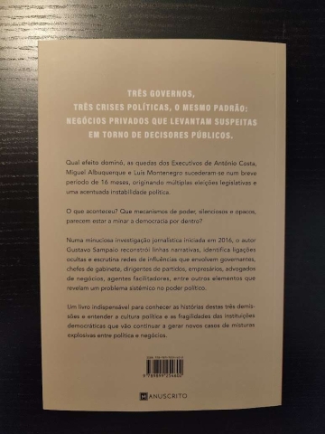 Numa minuciosa investigação jornalística iniciada em 2016, o autor Gustavo Sampaio reconstrói linhas narrativas, identifica ligações ocultas e escrutina redes de influências que envolvem governantes, chefes de gabinete, dirigentes de partidos, empresários, advogados de negócios, agentes facilitadores, entre outros elementos que revelam um problema sistémico no poder político.