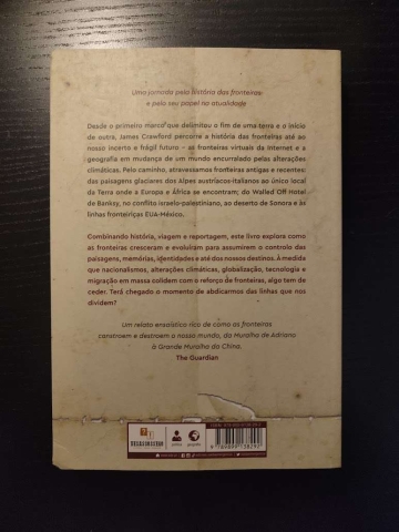 Desde o primeiro marco que delimitou o fim de uma terra e o início de outra, James Crawford percorre a história das fronteiras até ao nosso incerto e frágil futuro - as fronteiras virtuais da Internet e a geografia em mudança de um mundo encurralado pelas alterações climáticas. Pelo caminho, atravessamos fronteiras antigas e recentes: das paisagens glaciares dos Alpes austríacos-italianos ao único local da Terra onde a Europa e África se encontram; do Walled Off Hotel de Banksy, no conflito israelo-palestiniano, ao deserto de Sonora e às linhas fronteiriças EUA-México.