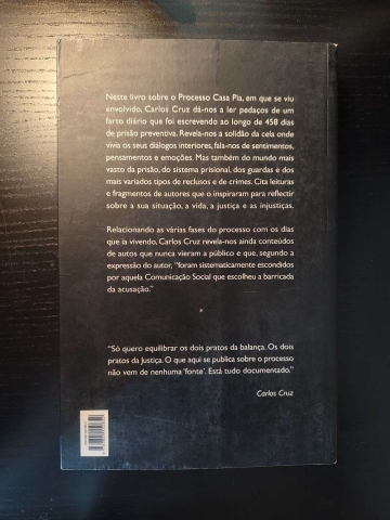 Neste primeiro livro sobre o processo Casa Pia em que se viu envolvido, Carlos Cruz dá-nos a ler pedaços de um farto diário que foi escrevendo ao longo de 458 dias de prisão preventiva. Revela-nos a solidão da cela onde vivia os seus diálogos interiores, fala-nos de sentimentos, pensamentos e emoções. Mas também o mundo mais vasto da prisão, do sistema prisional, dos guardas e dos mais variados tipos de reclusos e de crimes. Cita leituras e fragmentos de autores que o inspiraram para reflectir sobre a sua situação, a vida, a justiça e as injustiças.