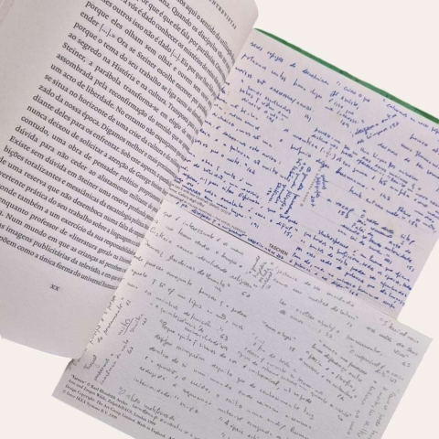 O leitor anterior analisou exaustivamente o texto, pelo que são visíveis anotações a lápis, bem como dois postais no interior com anotações diversas. Além disso, foram colados marca-páginas adesivos, sinalizando as diferentes temáticas abordadas (são facilmente retirados, caso pretendido).