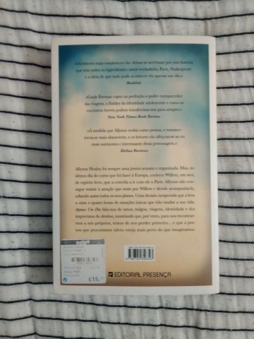 A vida de Allyson Healey que sempre foi planeada e organizada, muda no momento que conhece Willem, um ator de espírito livre, que a convida a ir com ele a Paris e a adiar todos os seus planos. Allyson não consegue resistir e decide acompanhá-lo, uma decisão inesperada que a leva a vinte e quatro horas de romance, liberdade e intimidade que irão mudar a sua vida. Apenas Um Dia é um romance que nos fala de amor, mágoa, viagens, identidade e das contingências provocadas pelo destino, mostrando que, por vezes, para nos encontrarmos a nós próprios, temos de nos perder primeiro...